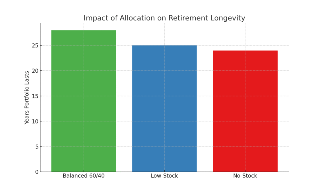 It’s tempting to say, “Stocks are too risky — I’ll just keep my money in bonds.” But here’s the trade-off: without growth, your money may not last as long.